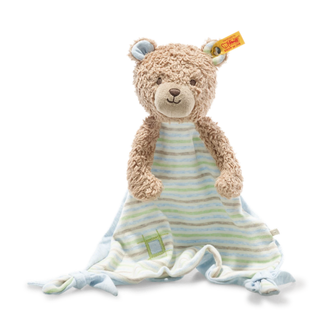 Auf das Rudy Teddybär Schmusetuch wird Ihr kleiner Liebling nicht verzichten wollen. Das 28 cm große Schmusetuch vermittelt Wärme und Geborgenheit. Der Geruch von Mama, Papa und der gewohnten Umgebung ist immer mit dabei: Im Kinderwagen, auf Reisen, bei Omi und Opi und auch abends im Bettchen. Das hübsche Gesicht zieren braun gestickte Augen, Nase und Mund. Das ebenso herrlich weiche Schmusetuch aus Kuschelbaumwolle ist an der Vorderseite gestreift in den Farben Creme, Hellgrün, Hellblau und Hellblau. Die Rückseite sowie die Knoten an den Ecken sind unifarben in Hellblau. Eine schöne Applikation setzt sich unten rechts in Szene.